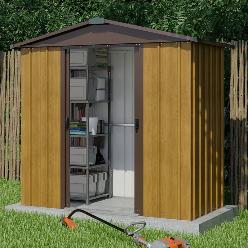 Beautifully designed, incredibly robust and backed by a superb 15-year anti-rust guarantee, the 6×4 Yardmaster Woodview Metal Shed is the perfect place to safely house your expensive tools, garden furniture or bicycles.Ã Ã Coating your shed in preservative and repairing torn roof felt will be jobs from the past once you’ve purchased this maintenance-free garden shed. Built from hot-dipped galvanised steel, this superior metal shed will never warp, crack or split, even in extreme weather conditions, and is also completely impervious to damage from bugs and pests. A traditional apex roof and a gorgeous baked-on woodgrain finish ensure that this garden storage shed doesn’t just boast brawn but beauty too, whilst the 7 layers of protection eliminate any risk of corrosion and ensure the shed’s immaculate appearance will endure for many years to come.Ã You can gain easy access to your stored items via sliding double doors, which are overlapping, include a padlock fixing (padlock not included) and are fitted with anti-tamper bolts, so rest assured that your prized possessions will be completely shielded from the elements and safe from unwanted attention. High gables make this 6×5 shed suitable for even our tallest customers, whilst ventilation along the ridge and eaves ensures optimum storage conditions. With dimensions of 199cm x 202cm x 137cm, this 6×4 shed is supplied with an anchor kit, clearly-numbered parts, an assembly manual, rust-resistant screws and UK-based telephone support to help you achieve a simple, stress-free assembly.Ã Ã **Please note that this metal shed comes without a floor (unless floor support kit selected) and should be erected on a level concrete or paved base. The optional floor support kit does not include a timber floor. If purchasing the floor support kit it cannot be returned alone should you decide not to build a floor.** Delivery is free to most UK addresses. 15-year anti-rust guarantee Made in Great Britain Built from hot-dipped galvanised steel 7 protective layers to prevent corrosion Lockable sliding double doors include anti-tamper bolts Ventilation along the ridge and eaves Weatherproof, even in extreme conditions Completely maintenance-free Includes anchor kit, numbered parts and rust-resistant screws **Supplied without flooring ** Free delivery to most UK addresses