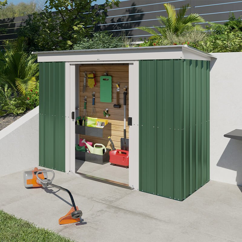 Store gardening equipment, bikes and other tools with ease thanks to the premium 8â x 4â Yardmaster Emerald Pent Metal Shed (2.38m x 1.19m). Strong, Durable and Built to Last With its sleek design and emerald green finish, this metal garden shed is a stylish alternative to the traditional wooden shed â and one that will last. The shedâ s constructed in the UK from high-tensile strength, hot-dipped galvanised steel, which offers seven layers of protection against corrosion, and has a strong ribbed roof and wall panels with folded edges for added safety. Best of all, the shed comes with an excellent 15-year anti-rust manufacturerâ s guarantee, protecting your investment for years to come. A Maintenance-Free Choice This 8â x 4â shed is virtually maintenance-free and weather-resistant too, so thereâ s no risk of peeling, warping or blistering. Vents along the top of the walls support air circulation and the steel construction prevents the metal shed from becoming brittle and breaking. Easy Access and Secure Sliding double doors and a strong entry/exit ramp make it easy to move your equipment, tools and bikes in and out of the shed. The doors have integrated weather seals to help keep wind and rain out, the door handles are attached by anti-tamper screws and thereâ s space to install a padlock (not included) for added security. Shipping and Installation We offer free delivery to the majority of UK postcodes. The shed has been designed without a floor, which means it needs to be installed on a level or paved base. A free anchor kit has been provided to help you secure the shed to your base. Yardmaster Metal Sheds The stylish Yardmaster metal garden sheds are available in a variety of different sizes and colours, including grey, green and silver. Check out the full range to find the perfect fit for your garden. Key Features Premium emerald green metal garden shed15-year anti-rust guaranteeMaintenance-free, weather-resistant and built to lastMade in the UK from hot-dipped galvanised steel, with seven layers of protectionSliding double doors with anti-tamper handlesVentilation slots along the top of the wallsIncludes free anchor kit