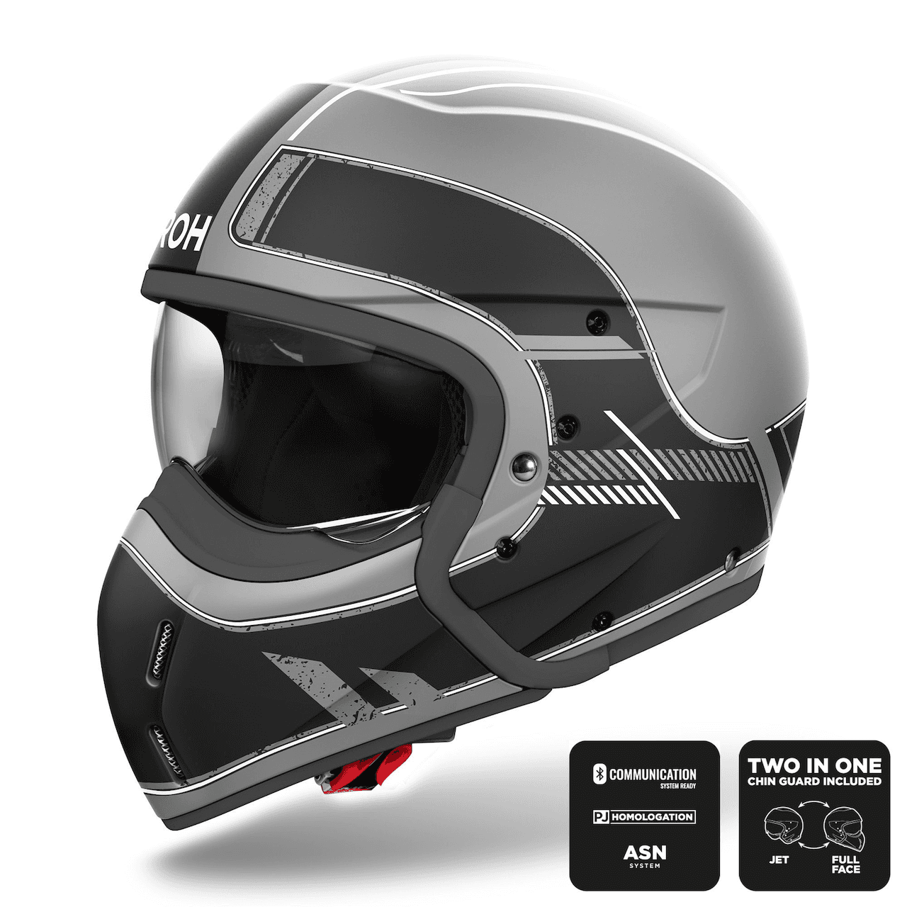 AIROH J110 HELMET – RASTER BLACK MATTDesign with a captivating and absolutely unmistakable style, this helmet ignites your desire to ride by making your adventurous and explorer spirit shine. Versatile and ready for anything, a 2 in 1 helmet devised for those who dont want to settle with a standard product, it is perfect for those who do not want to compromise, especially in terms of performance, and for those who want to feel free to enjoy any adventure. Aggressive lines, with a vaguely vintage and refined style, are completed with brilliant graphics and colors aimed at satisfying even the most demanding bikers. Key FeaturesTwo different Composite Carbon shell sizesOptimized inside the wind tunnelECE 2206 approvedComposite CarbonMicrometric retention systemCoolmax ®Superior Performance Technical Textiles 2dry Microsense SanitedRemovable and WashableHypoallergenicRemovable summer nose coverJet version tapsStop wind Sizing GuideXS 53-54S 55-56M 57-58L 59-60XL 61-622XL 63-64 Motorcycle helmets are designed for a close and comfortable fit but can change size with use. To find the correct size, we would recommend seeking fitment advice, and trying the helmet before purchasing. Please use the size guide to help in finding which size helmet you need, note this is only a guide and cannot determine an exact size.Tinted visors are for illustration purposes only, not for UK Road use, all motorcycle helmets are supplied with a clear visor.Quick code-ARH246
