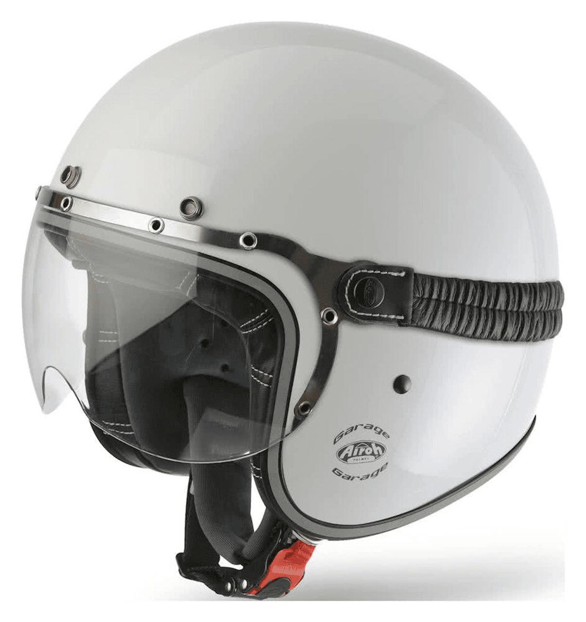 AIROH HELMET GARAGE JET – COLOUR WHITE GLOSSGarage is Airoh’s new ultra-compact urban jet helmet, designed with a classic and vintage look, befitting the café racer and custom urban scene. Key FeaturesHPC (High PerformanceFull Carbon shellOne of the smallest and lightest urban jet helmets on the marketRemovable and washable hypoallergenic inner liningFaux vintage leather internal detailingComplete with vintage style gogglesSubtle reflective edge trim for increased visibilityGreat fitting and comfortMicrometric retention systemWeight: 710g +/- 50gBubble, long peak and retro visors available separatelySizing GuideXS 53-54S 55-56M 57-58L 59-60XL 61-622XL 63-64 Motorcycle helmets are designed for a close and comfortable fit but can change size with use. To find the correct size, we would recommend seeking fitment advice, and trying the helmet before purchasing. Please use the size guide to help in finding which size helmet you need, note this is only a guide and cannot determine an exact size.Tinted visors are for illustration purposes only, not for UK Road use, all motorcycle helmets are supplied with a clear visor.Quick code-ARH044