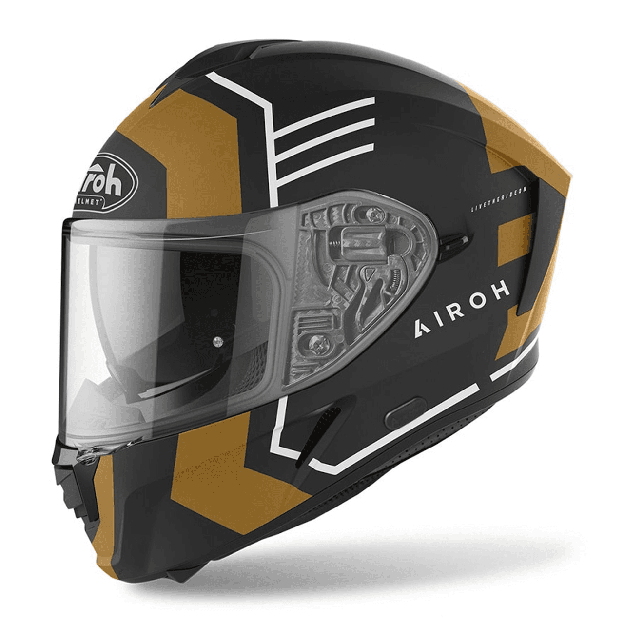 AIROH SPARK THRILL HELMET – GOLD MATTThe Airoh Spark Full-Face Helmet is made of HRT (High Resistant Thermoplastic) with its aggressive styling and aerodynamic lines, you will feel completely comfortable in every situation be that on the race track, the commute or road trip. Developed with wind tunnel technology and developed on 2 different external shell sizes. The all new ‘Spark’ will ignite your desire to get out and ride your bike further than ever before, whatever your destination. An Extra-Wide Visor for superior vision, integrated Sun Screen Visor for riding in any weather, Bluetooth-Ready for your music and communication devices, advanced ‘Wind stop’ technology and a Pinlock ready visor with Pinlock Lens included, complete this top-of-the-range helmet. Key FeaturesAnti-UVextra wide visorintegrated sun visorBluetooth Readinesssimple and safe visor mechanism enables quick removal and installation without toolsInner lining breathable, hypoallergenic and removablePinlock ReadySizing GuideXS 53-54S 55-56M 57-58L 59-60XL 61-622XL 63-64 Motorcycle helmets are designed for a close and comfortable fit but can change size with use. To find the correct size, we would recommend seeking fitment advice, and trying the helmet before purchasing. Please use the size guide to help in finding which size helmet you need, note this is only a guide and cannot determine an exact size.Tinted visors are for illustration purposes only, not for UK Road use, all motorcycle helmets are supplied with a clear visor.Quick code-ARH164