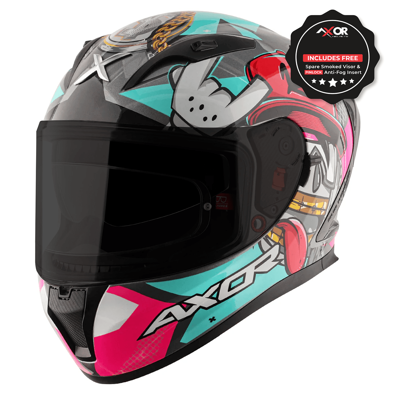 Axor Helmet Street Full FaceStreet, the sport-touring helmet designed to satisfy the needs of riders looking for maximum protection, stability and aerodynamic performance. Features an aerodynamic spoiler designed for extra stability at high speed and comfort on long rides.VentilationDual top vent air intakes are situated to maximize air volume into the helmet interior. Exhaust port integrated within the aero-spoiler, enables optimum flow-through ventilation. Chin vent intake. Removable chin-guard wind stopper. Removable breath deflectorVisionOptically correct clear visor. Internal UV sun visor. Quick toolless visor change mechanism. Innovative visor mechanism pivots front and back to ensure a wind and waterproof seal. Scratch-resistant Visor.Key FeaturesFREE Smoked Visor and Pinlock IncludedECE 22.06 / DOT certifiedACU Gold ApprovedIntegrated aerodynamic spoiler for stabilityDouble D-ring for a secure fitHigh-Performance ABS constructionRemovable & washable linerBluetooth communications compatible1600g 50Sizing Guide (cm)XS 53-54S 55-56M 57-58L 59-60XL 61-622XL 63-64Motorcycle helmets are designed for a close and comfortable fit, but can change size with use. To find the correct size, we would recommend seeking fitment advice, and trying the helmet before purchasing. Please use the size guide to help in finding which size helmet you need, note this is only a guide and cannot determine an exact size.Quick code-AXR028