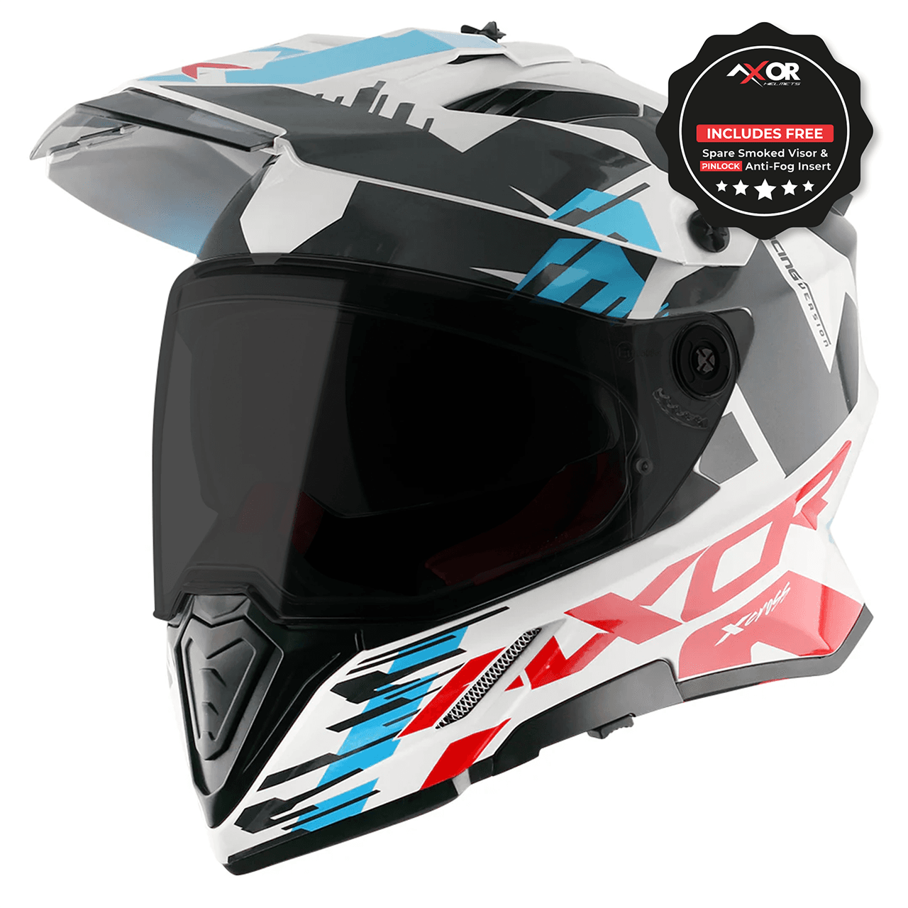 Axor Helmet X-Cross AdventureX-CROSS X1, a true adventure sport-touring helmet designed to perform on and off road, all weathers and terrains.VentilationDual top vent air intakes are situated to maximize air volume into the helmet interior. Dual exhaust ports enable optimum flow-through ventilation. Chin vent intake. Integral breath deflectorVisionOptically correct clear visor. Internal UV sun visor. Quick visor change mechanism. Scratch-resistant VisorKey FeaturesFREE Smoked Visor and Pinlock IncludedECE 22.06 / DOT certifiedAdjustable dual sport peakWide vision apertureDouble D-ring for a secure fitHigh-Performance ABS constructionRemovable & washable linerBluetooth communications compatible1350g 50Sizing Guide (cm)XS 53-54S 55-56M 57-58L 59-60XL 61-622XL 63-64Motorcycle helmets are designed for a close and comfortable fit, but can change size with use. To find the correct size, we would recommend seeking fitment advice, and trying the helmet before purchasing. Please use the size guide to help in finding which size helmet you need, note this is only a guide and cannot determine an exact size.Quick code-AXR017