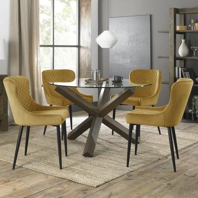 Bentley Designs Turin Glass 4 Seater Round Dining Table Dark Oak Legs with 4 Cezanne Mustard Velvet Chairs – Black Legs