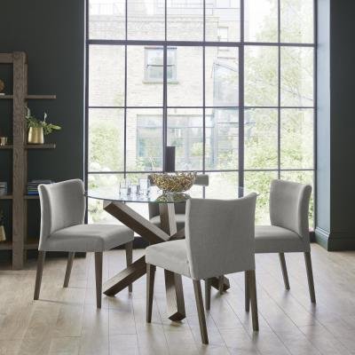 Specification: Bentley Designs Turin Glass 4 Seater Round Dining Table Dark Oak Legs with 4 Low Back Chairs in Pebble Grey Fabric
