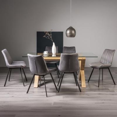 Bentley Designs Turin Glass 6 Seater Dining Table Light Oak Legs with 6 Fontana Grey Velvet Chairs