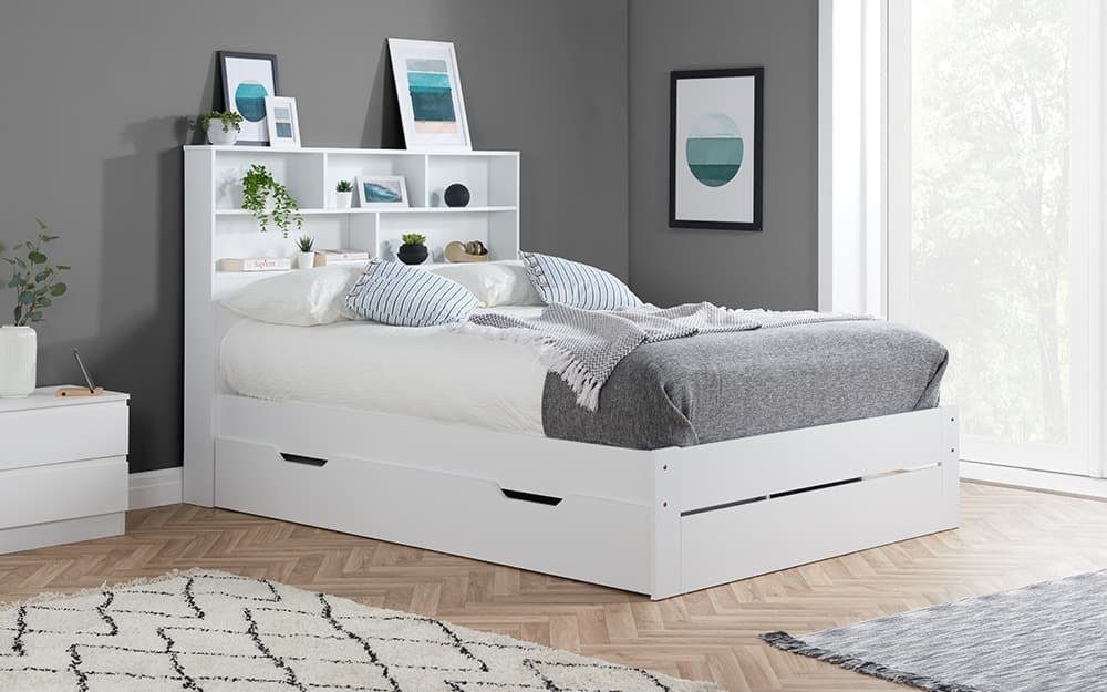 Minimise clutter and add style to your space with the Birlea Alfie Storage Bed Frame. Choose from two storage options: An attractive framed headboard perfect for displaying photographs, trinkets or books, or a spacious wheel out drawer for storing larger items. This versatile drawer can be attached either side of the bed allowing access to suit your space. The frame is constructed from sturdy particle board, a more affordable, eco-friendly alternative to natural wood, and is finished in a neutral white colour making it adaptable to any interior style. Finally, a solid slatted base reliably supports your mattress.