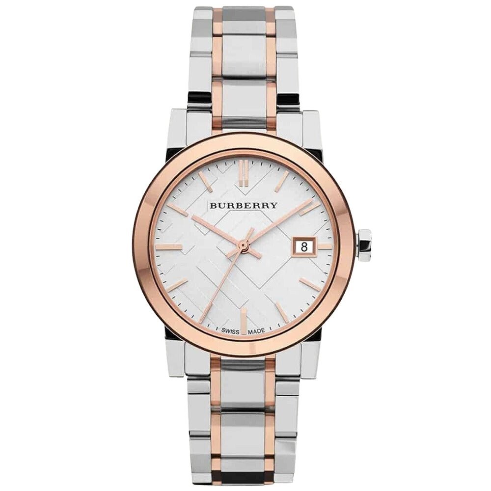 Discover luxury and elegance with the Burberry BU9105 The City Unisex Watch in silver and rose gold, a Swiss-made timepiece exuding contemporary style and precision.
