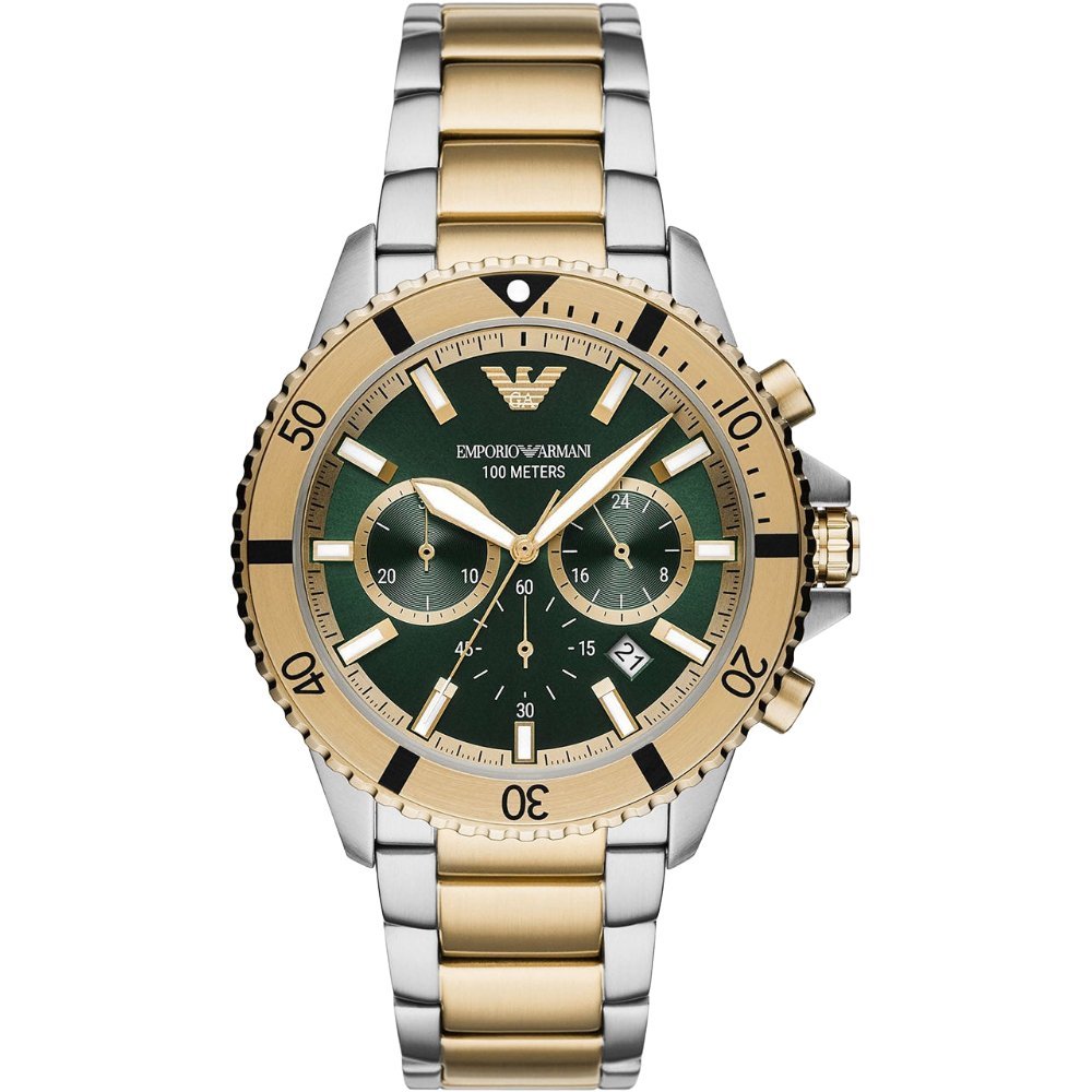 The Emporio Armani AR11586 Diver Watch for men is a robust and stylish timepiece designed for both function and fashion. Featuring a multicolour stainless steel band and case, this watch is water-resistant up to 100 meters, making it perfect for diving enthusiasts. The green dial, complemented by luminous numbers and hands, ensures clear readability in any environment. Equipped with a chronograph, stopwatch, and 24-hour display, this watch offers comprehensive functionality. The fold-over clasp with a push button ensures a secure fit, while the turnable bezel adds to its sporty appeal. Ideal for those who appreciate precision and style in a timepiece.