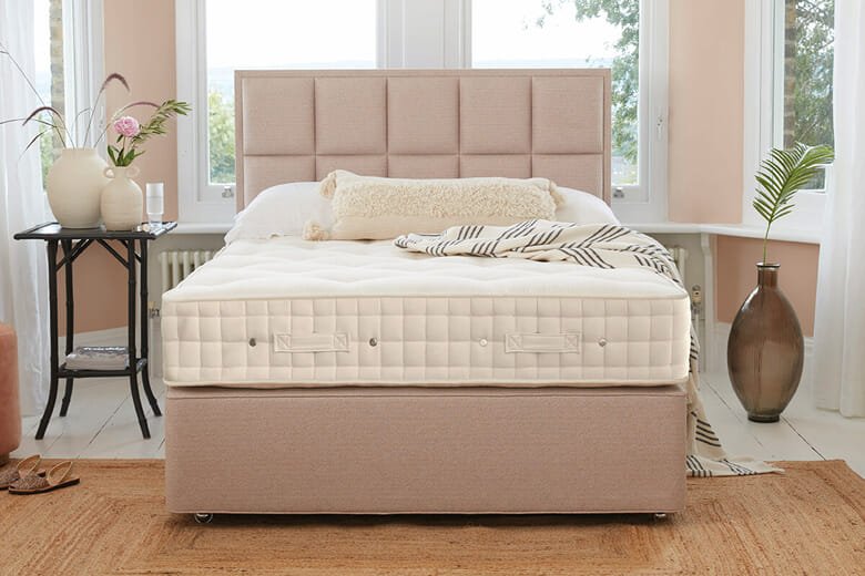 Since 1904, Hypnos have been dedicated to creating ‘the most comfortable beds in the world’. The Hypnos Orthos Support 8 Mattress is no exception to this, featuring innovative modern designs combined with traditional techniques passed down through generations. You’ll also sleep better knowing that this mattress uses responsibly sourced materials, including the ingenious eOlus™ fibre support pads. ReActive™ 8-turn pocket spring system Taking pocket springs to a new, technologically advanced level, Hypnos have created the ReActive™ 8-turn pocket spring system. These springs feature an incredible eight active turns in each continuous coil, allowing them to tailor support exactly where you need it at a much faster response rate than regular pocket springs. Moving independently, these springs focus support directly to your heaviest pressure points, for example your hips and shoulders, ensuring they are supported and aligned comfortably throughout the night. This innovative system is sandwiched between two layers of eOlus™ fibre support pads, resourcefully made from recycled polymer based products. These fibres enhance the breathability of the Hypnos Orthos Support 8 Mattress, encouraging airflow and keeping you cool and refreshed throughout the night. These eOlus™ fibre support pads also offer additional support to your body, encouraging spinal alignment and posture control. Climate control unit regulates your temperature throughout the night Featuring both cotton and British wool layers, the Hypnos Orthos Support 8 Mattress offers enhanced levels of comfort. A durable, soft and fluffy fibre, cotton aids the absorption of excess moisture before wicking it away to leave you cool, dry and refreshed. British wool also wicks away excess moisture, but also acts as a climate control unit, regulating your temperature throughout the night and keeping you warm in the winter and cool and fresh in the summer. Wool also inhibits the growth of bacteria fungi and dust mites with its enhanced breathability, promoting a healthy sleeping environment. A double layer of gently cushioning Solotex™ fibres cradle you in comfort, ensuring you’re kept feeling soft and cosy all night long. Double sided, you’re able to flip the Hypnos Orthos 8 Support Mattress over with the seasons to experience the support and comfort of the natural fillings as new. Hand tufted to prevent sagging and create edge-to-edge support, this mattress is a true staple of British quality.