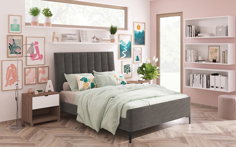 Novo – Madelin Silver Velvet Bed Frame – Double – Fabric Bed Frame – Velvet Bed Frame – Upholstered Bed