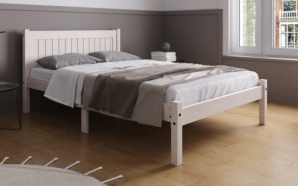 The Birlea Rio Wooden Bed Frame is a sturdy, classic wood bed frame with a Shaker style headboard. It’s practical but pleasing to the eye and comes with a wallet-friendly price tag. This bed frame is sturdily constructed out of enduring pine with a firm, supportive wooden slatted base. The base also features a central support bar with reinforcing legs that enhance stability for both the frame and mattress. You can choose from an antique wax or whitewashed finish to match your bedroom style.