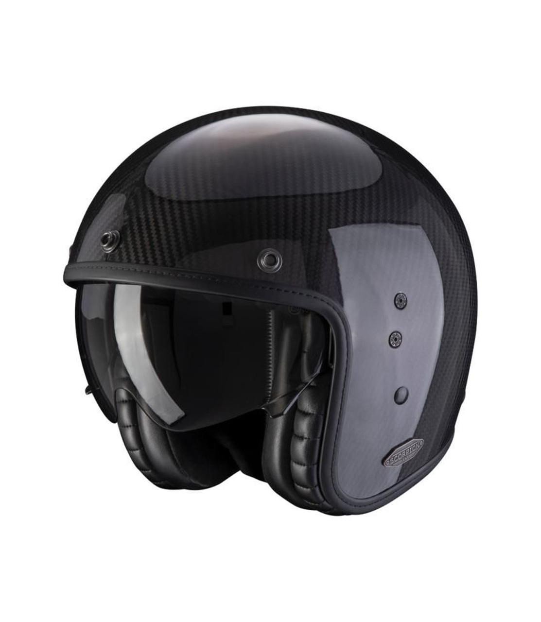 Scorpion Exo-Belfast Carbon helmet The Belfast Gloss Carbon EVO design offers a Light helmet with perfect balance of retro style with hand-stiched liner, elegant plush interior,luxurious off-set stiching, and real leather accents. Now ECE 22.06 homologated, this jet helmet with a look and inspiration from the CAFE RACER you always dreamed about, SCORPION gives you the BELFAST EVO Carbon.This helmet has lots of assets and features.It will entice you with a harmonious design which pays homage to the classic heritage 3/4 open face helmets.Lightweight and comfortable, which will make you appreciate your whole ride.The retractable sun visor, treated with anti- fog, tinted light or dark smoked, will ensure your comfort and serenity.Moreover this helmet will seduce you thanks to the quality and the softness of the liner which is of course removable and washable.Finally the micrometric Automatic Chinstrap allows you to adjust the chin strap perfectly in order to ride in complete tranquility. Key Features Lightweight carbon construction Internal light smoked sunvisor Hand-stitched leather trim Plush liner Removable and washable interior Quick release micro buckle strap type Sizing Guide XS 53-54 S 55-56 M 57-58 L 59-60 XL 61-62 2XL 63-64 Motorcycle helmets are designed for a close and comfortable fit, but can change size with use. To find the correct size, we would recommend seeking fitment advice, and trying the helmet before purchasing. Please use the size guide to help in finding which size helmet you need, note this is only a guide and cannot determine an exact size. Quick code-EXBECA